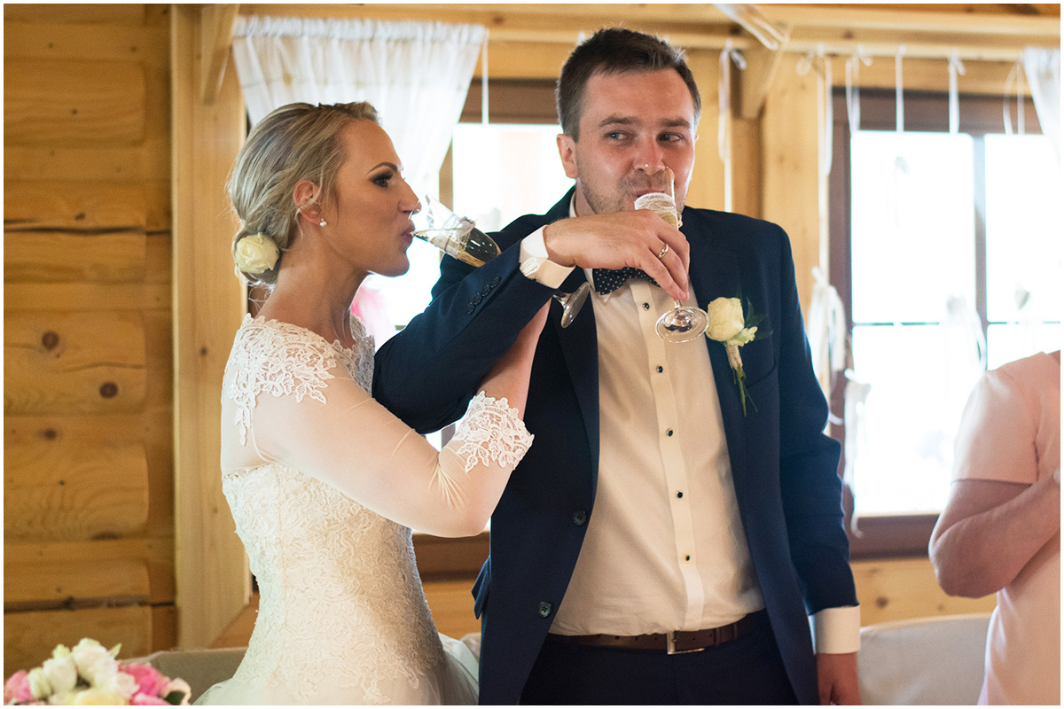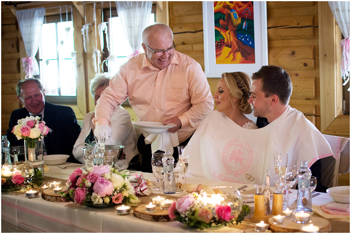 V svadobnej sále mali mladomanželia pripravené ďalšie tradície od ženíchovej rodiny, tentoraz ruské. Mamina s otcom ich privítali vlastnoručne upečených chlebom a soľou. A možno neviete, ale traduje sa, že kto si odlomí väčší kus chlebu bude hlavou rodiny. My vieme, kto to bol . Svadobná hostina sa začala. Jedlo, zábava, hudba, program boli perfektné. Zábava sa veľmi rýchlo rozprúdila a DJ Feri hral až do skorého rána.