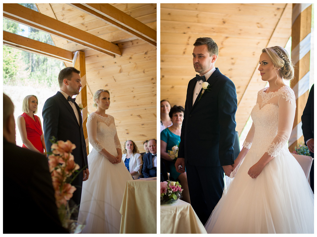 Krásne slnečné počasie, dobrá nálada, tak začali svadobné prípravy nevesty a ženícha. Pomaly začali prichádzať svadobný hostia, priatelia, aby pomohli s prípravami. Aj keď bol menší časový sklz, o chvíľku sme sa mohli vybrať na fotenie. Ako prvé miesto sme vybrali kaštieľ v Oščadnici a jeho krásny park. Keďže ženích je vášnivý rybár, dalším miestom bol oščadnický potok. Nafotili sme super portéty a vrátili sme sa opäť k hotelu, kde už bolo všetko pripravené a svadobný hostia čakali na príchod snúbencov. Svoje áno si Mirka s Alexom povedali v prírode v altánku hotela. Ako je dobrým zvykom na Slovensku, svadobné tradície sa dodržiavajú a na Kysuciach ešte viac. Majiteľ hotela privítal mladomanželov a hostí írečito, plieskaním biča a prípitkom. A by to ženích nemal také jednoduché, čakalo ho pílenie a rúbanie dreva. Alex bol prekvapený, lebo slovenské zvyky veľmi neovládal. Milým prekvapením od pána majiteľa bola sabráž sekerou a prípitok šampanským. Asi žiadna svadba sa nezaobíde bez rozbíjania taniera, spoločného zametania črepín a prenesenia nevesty cez prah.